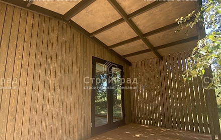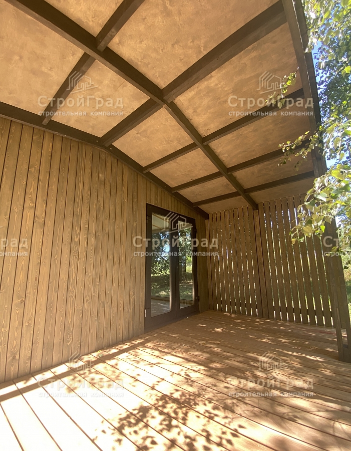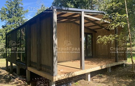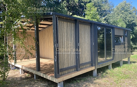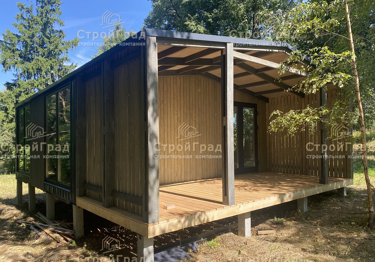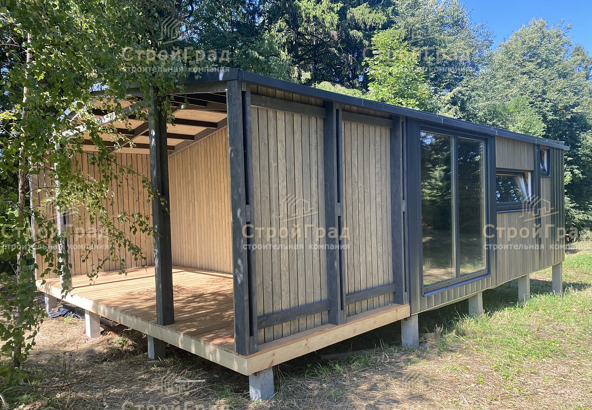 Современный жилой дом из 2-х модулей по проекту Double Classic с двускатной крышей, крытой террасой. Внешняя отделка металлическим сайдингом RAL 7024 и деревянным планкеном цвет "Киви". Изготовлен в базовой комплектации . Расположен в д.Александрово,Истринского р-на. от 19.05.2023