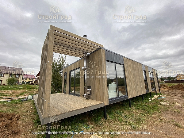 Дом с теплым контуром, черновым полом из OSB, полностью отделанным фасадом, остеклением, входной дверью и кровлей.