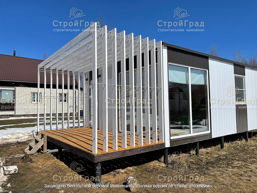 Дом с теплым контуром, черновым полом из OSB, полностью отделанным фасадом, остеклением, входной дверью и кровлей.